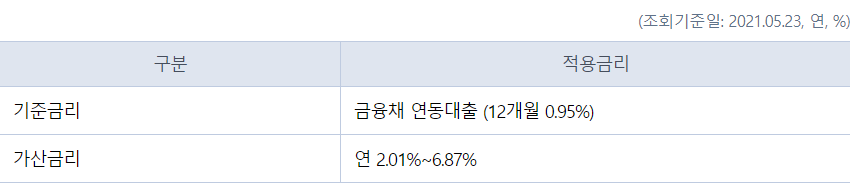 신규대출 기준 예시이며 실제 적용금리는 개인별 거래조건 및 신용상황에 따라 달라질수 있습니다. 기준금리는 12개월마다 변동됩니다.