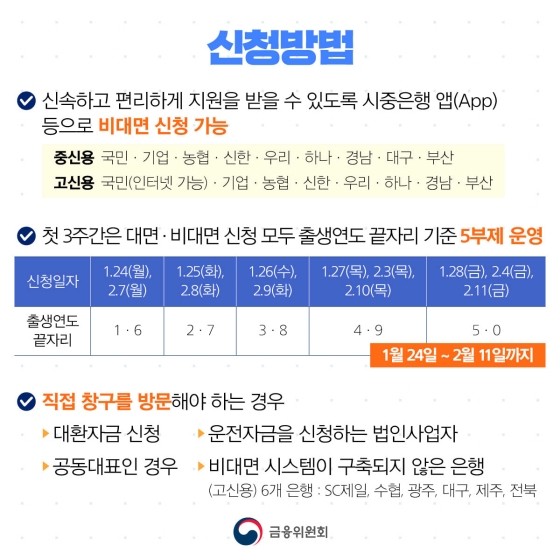 대면 신청·접수도 현장에서의 집중도 완화를 위해 첫 3주간(1.24~2.11)은 5부제가 동일 적용됩니다.