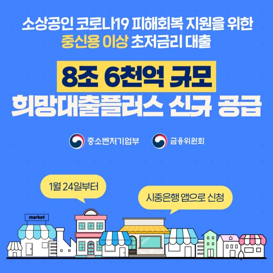 정부는 중신용 이상 소기업·소상공인의 피해회복 지원을 위해 초저금리의 ‘희망대출플러스’ 8조 6천억 원을 1월 24일(월)부터 공급합니다. 지난해 말부터 지속되고 있는 강화된 거리두기 조치로 누적된 소상공인의 피해회복을 지원하기 위해, 신용도에 따라 1~1.5% 초저금리로 1,000만원까지 대출하는 총 10조원 규모의 정책자금으로, 소상공인 1·2차 금융지원 프로그램 등 타 정책자금을 받은 경우에도 중복해서 신청할 수 있습니다. 단 저신용·중신용·고신용 프로그램 중 1가지만 신청 가능하고, 소진공의 ‘일상회복특별융자’를 지원받은 경우는 추가 신청이 불가합니다.